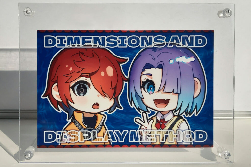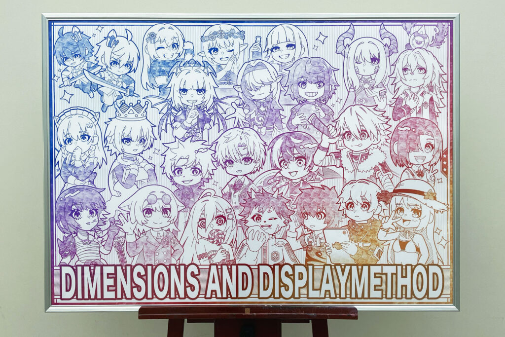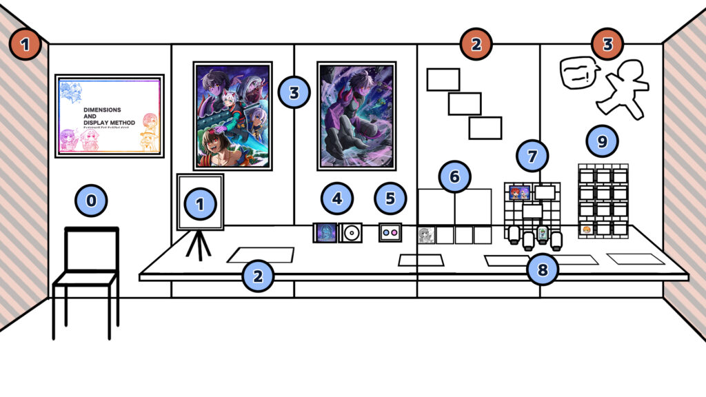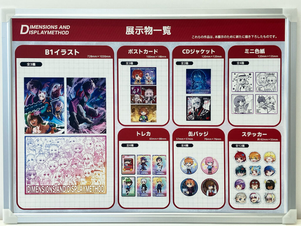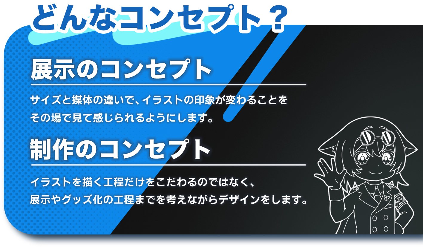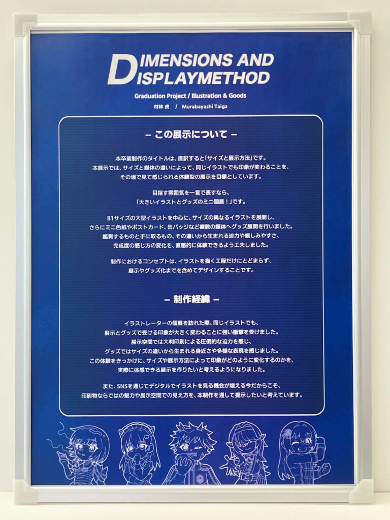 遠目ではB1サイズの存在感が際立ち、近づくことでグッズのイラストにも目が向くような配置を想定しました。 サイズの異なる作品を並べることで、印象の違いが自然に伝わる展示構成を考えました。