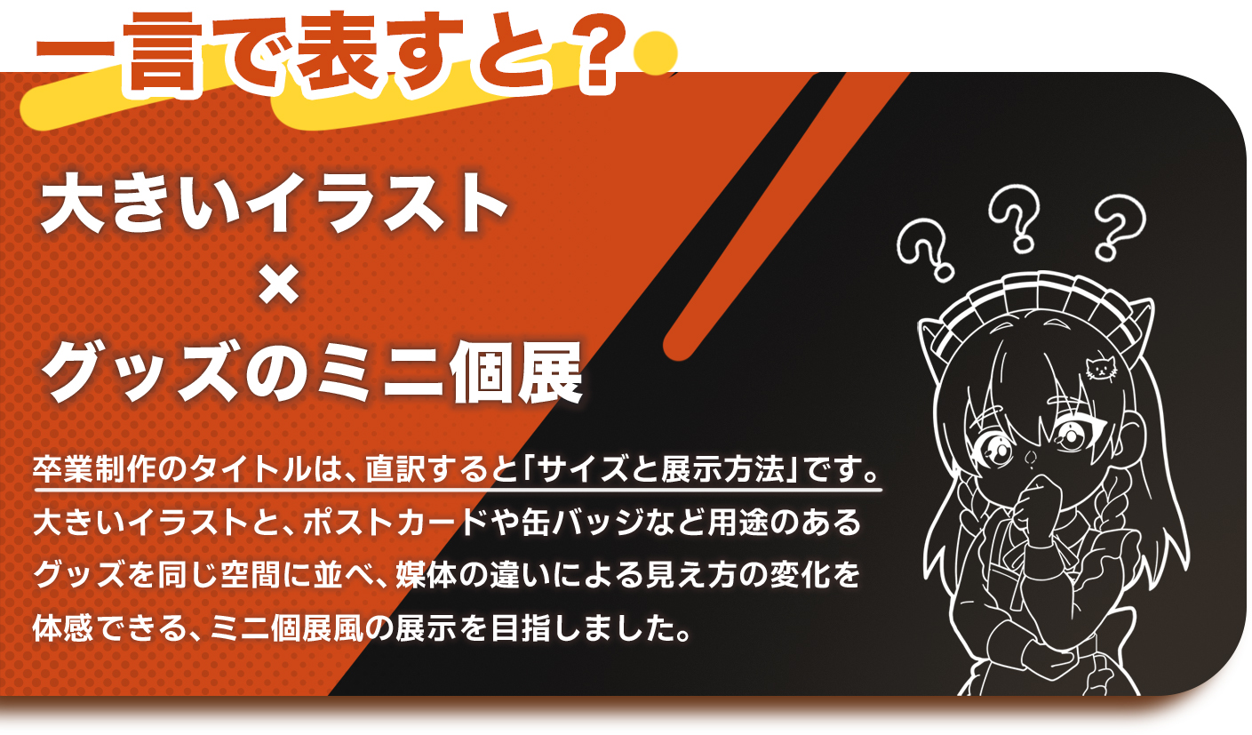 また、近年SNSでイラストを見る機会が増える中、デジタルでは伝わりにくい印刷物の魅力や展示空間での見え方を、作品制作を通して提示したいと考えました。